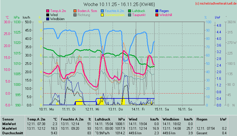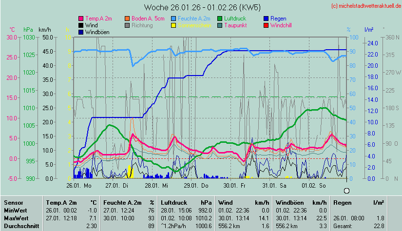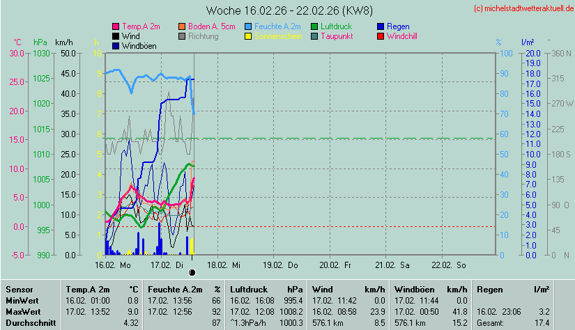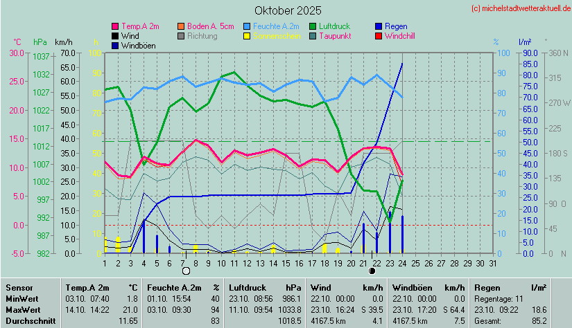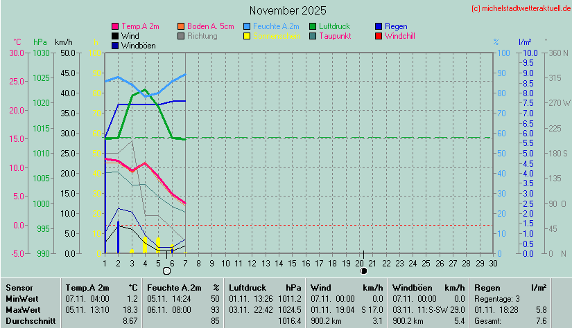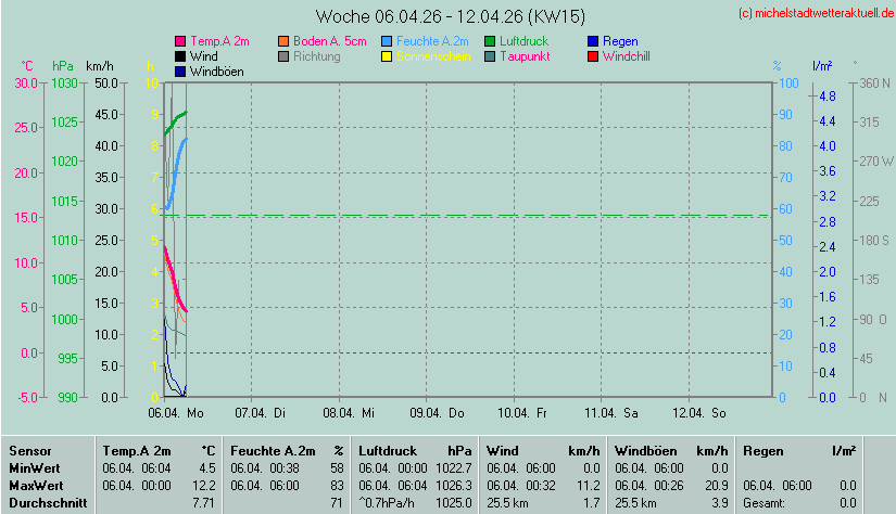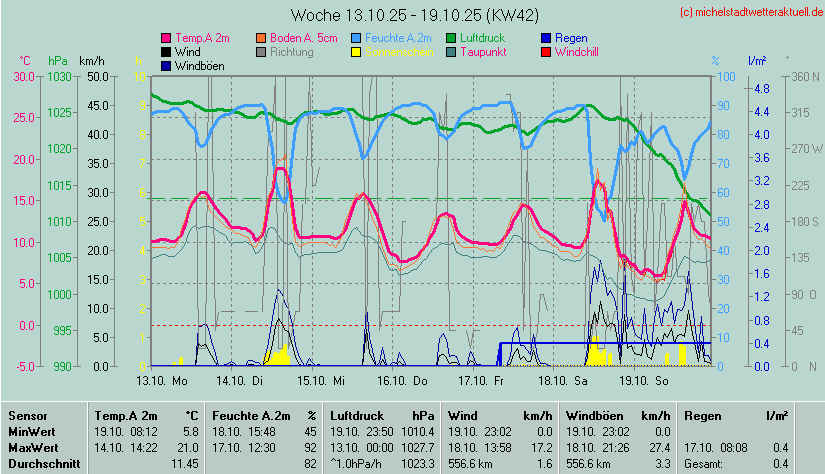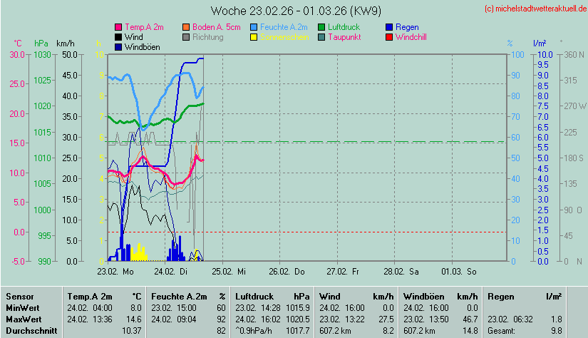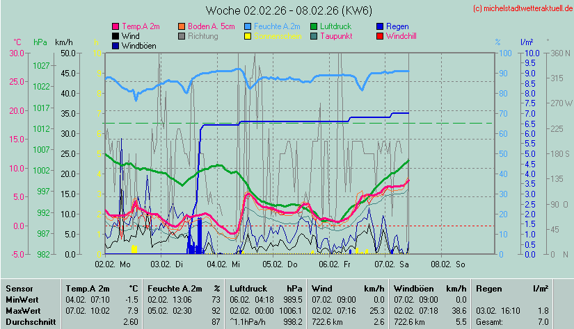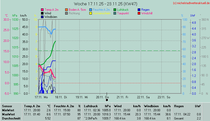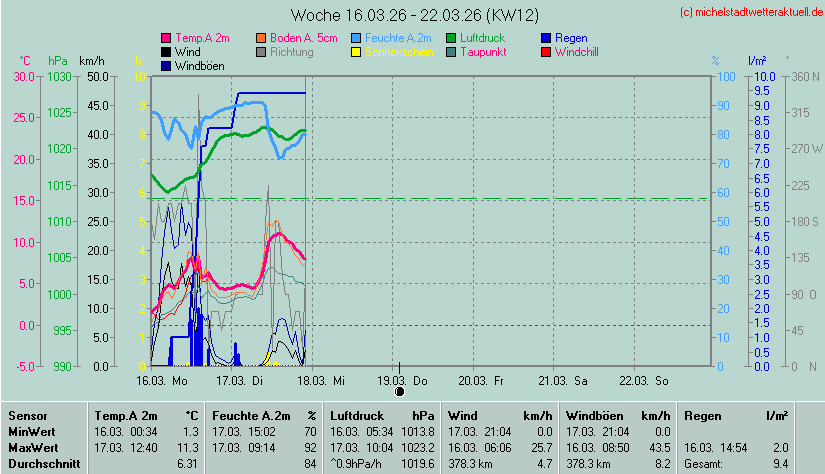 Wetterübersicht - Michelstadt 255 m über NN - 49°44'53"Nord - 8°51'3"Ost Die Minimal- und Maximalwerte beziehen sich auf die letzten 24 Stunden. Die Wetterwerte werden alle 5 Minuten aktualisiert. |